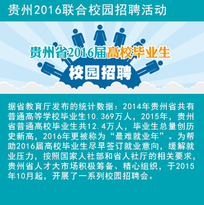 貴州省人才大市場(chǎng)結(jié)合多年校園招聘活動(dòng)的經(jīng)驗(yàn),從提供簡(jiǎn)單的招聘會(huì)展服務(wù),逐步演變成為提供高校就業(yè)招聘平臺(tái)、就業(yè)政策宣傳、企業(yè)形象展示、就業(yè)指導(dǎo)服務(wù)、高校畢業(yè)生人才庫等綜合性服務(wù),并建立與高校就業(yè)管理部門的長期合作機(jī)制,以更好推動(dòng)高校畢業(yè)生就業(yè)工作。