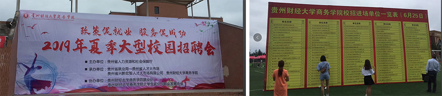 | 6月25日,貴州省人才大市場攜手貴州財經大學商務學院在學校足球場上舉辦了貴州省2019年(上半年)高校畢業(yè)生校園招聘活動。本次活動由貴州省人力資源和社會保障廳主辦;貴州省就業(yè)局、貴州省人才大市場、貴州省興黔宏智人才大市場有限公司承辦;貴州財經大學商務學院協(xié)辦,以“政策促就業(yè)、服務促成功”2019年夏季大型校園招聘會為活動主題。充分體現(xiàn)了主辦方對全國高校畢業(yè)生就業(yè)工作的支持及付出,也展示了承辦、協(xié)辦方有能力、有信心做好每一場校園招聘會活動,打贏這場持久的就業(yè)攻堅戰(zhàn)。 |